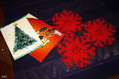 Pakken har jeg fått fra Maret. Jeg ble vinneren av trekningen i forbindelse med 1-års - jubiléet som hun hadde her i høst. Tre fine heklede julebrikker, et koselig kort, en eske med god sjokolade. Så nå går jeg å setter på kaffen, snart har vi en liflig duft her og kan kose oss...